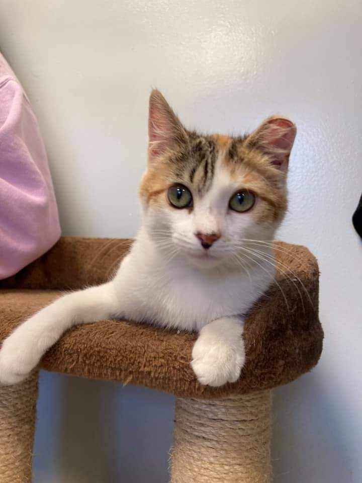 Lean and muscular, of average height and weight. Sparrow's short but thick fur is mostly white, with patches of brown and cream tabby across her head, tail and back. Green eyes.