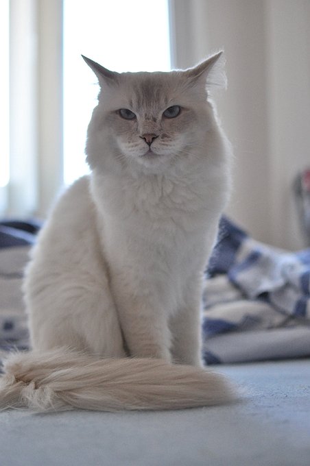 A medium-sized white she-cat with the faintest dusting of pale gray across her paws, tail and face, with blue eyes. Faint tabby markings on her face.