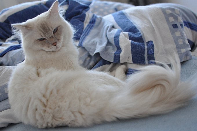 Pelt: Mediumhaired, fluffy lilac lynx point